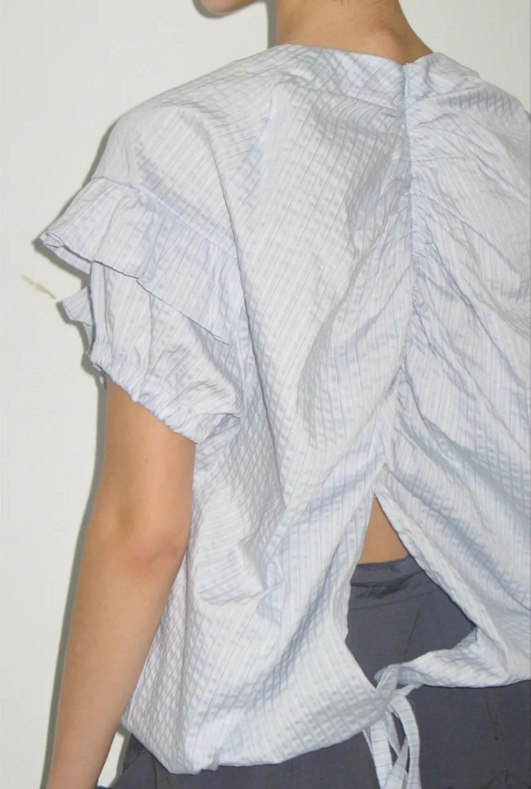 袖にはたっぷりフリルがついていて、首元は紐で調節可能。