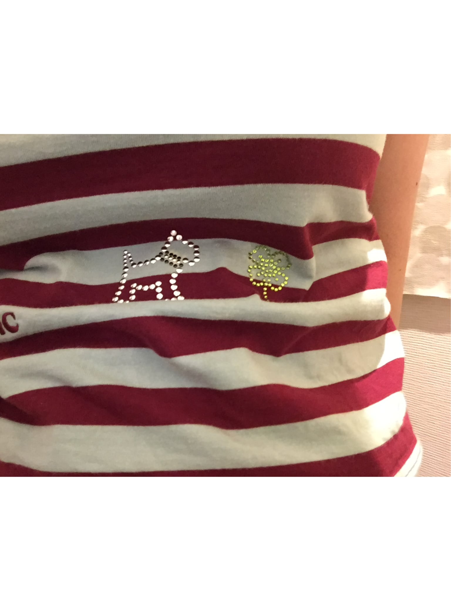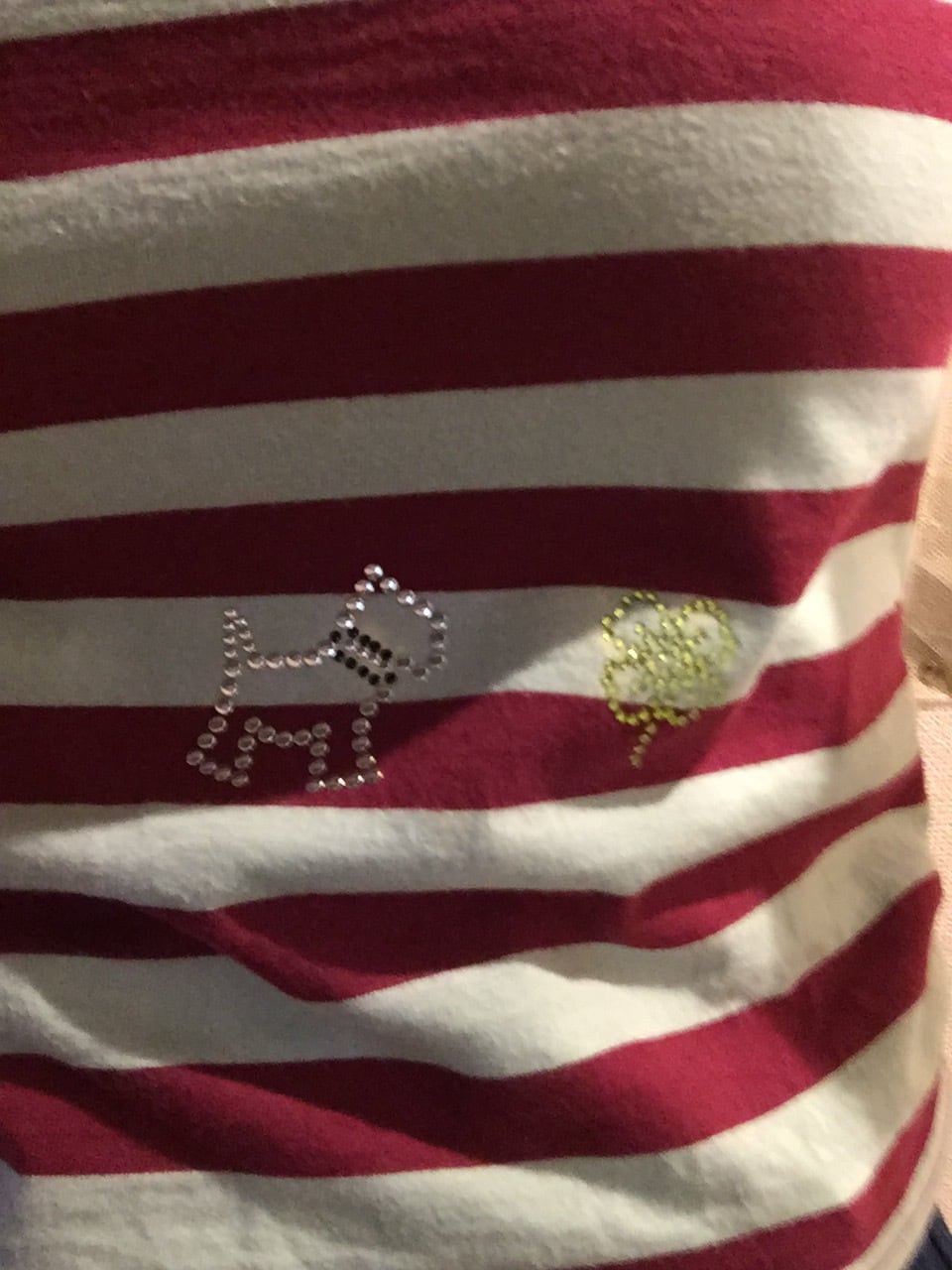 でも私はそれでもこのTシャツを着続けたかったので、ストーンのワンコと、クローバーをアイロンプリントで覆っております。